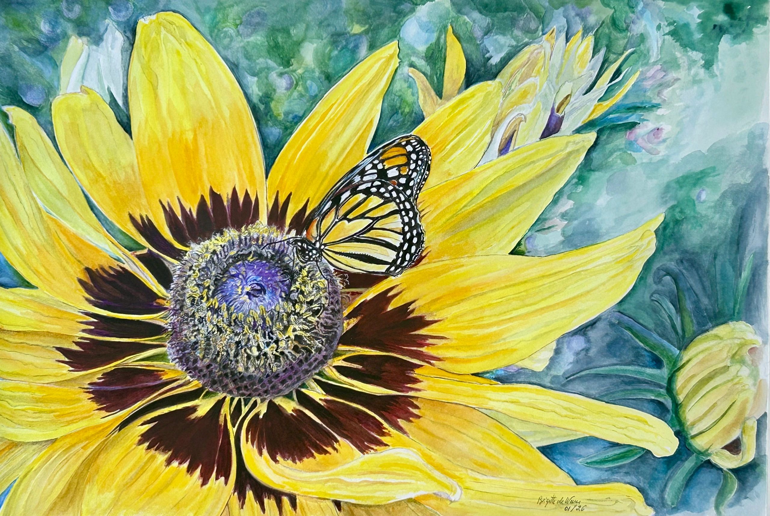 "Gloriosa Daisy's world for Monarch", January 2026, watercolor on hot press Arches paper 300lb. Unframed for now 14.5X20